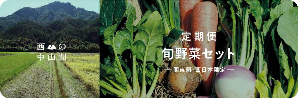 お野菜の内容はおまかせ。四季を通じて、西の中山間で採れた季節の旬が味わえる野菜セットです。