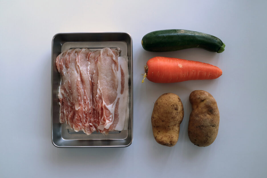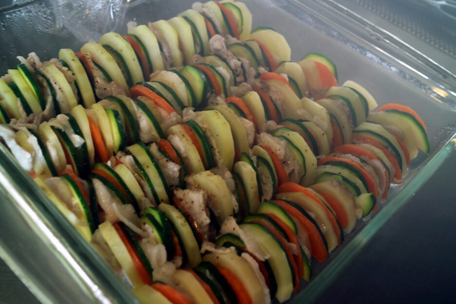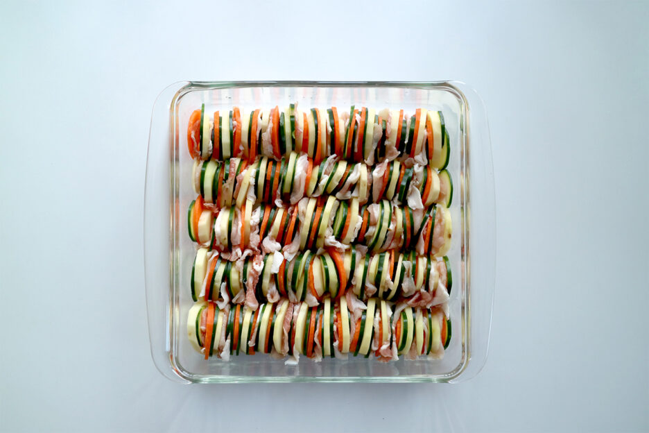 2.耐熱皿にそれぞれのお野菜とその大きさに切り揃えた豚肉を交互に重ね、塩コショウを適量ふる。