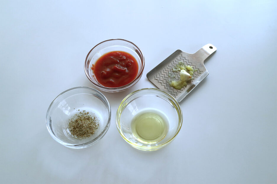 にんにくおろしチューブでOK。市販のピザソースでもいいのですが、これ簡単なので食パンでピザ風なんて時も使えます。本格的には、玉ねぎをすり下ろして火にかけたり、ウスターソースやマヨネーズも加えたりと手間をかけるのですが、手抜きピザソースでも十分おいしいです。