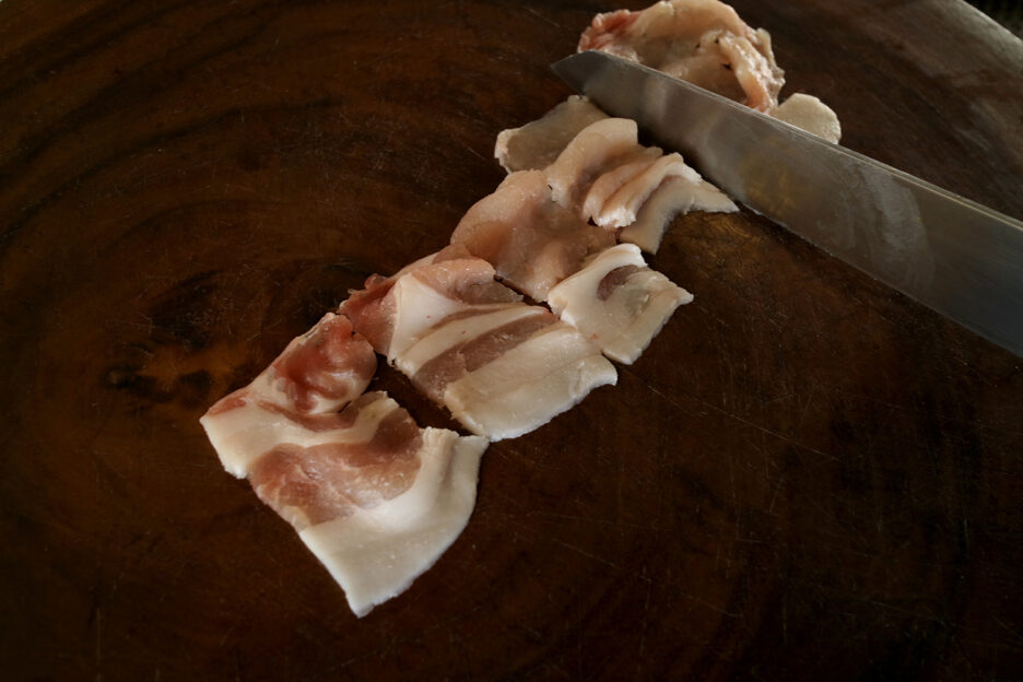 豚肉も切ったお野菜と同じくらいに切り揃えます。