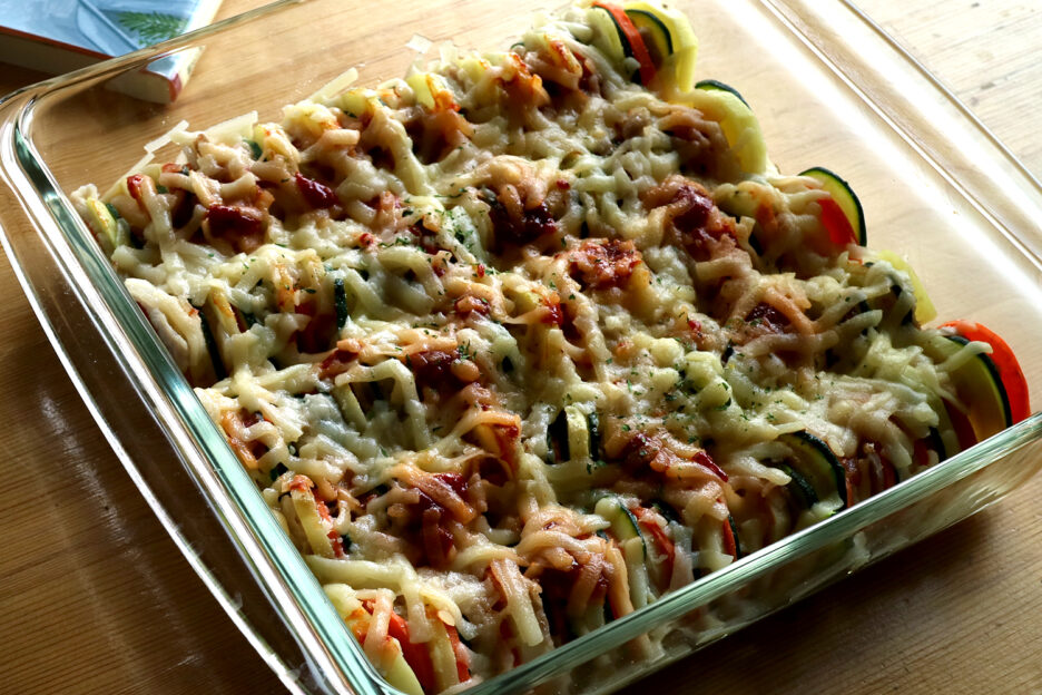 ズッキーニメインで多めだったので、不規則な並びになりました。これって性格が出そうですね。ちょっと面倒な感じがしますが、1品並べて差し込む感じで入れていけば、案外早い。♪鼻歌も忘れないで。