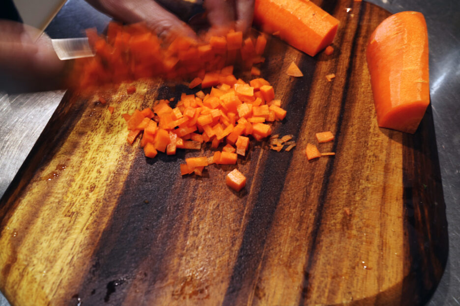 3. 人参に火が通ったあたりで、小松菜を加えて炒め、少ししんなりしたところでAを加えて10分程度、水気が無くなればできあがり。