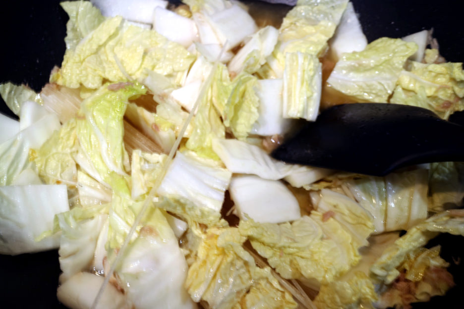 フライパンにAを入れて中火で熱し、香りがでたらツナ、白菜、マロニーとBを加えてかき混ぜながら4~5分煮ます。