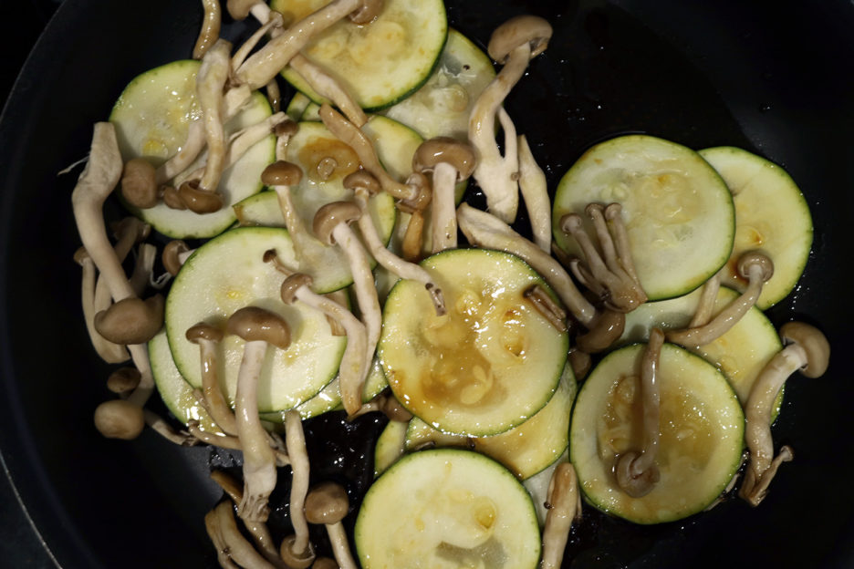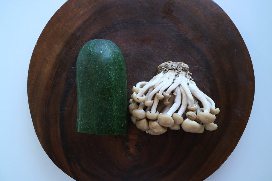 ズッキーニは5mm幅に切り落とし、しめじは根元を切り落とし、手でほぐす。